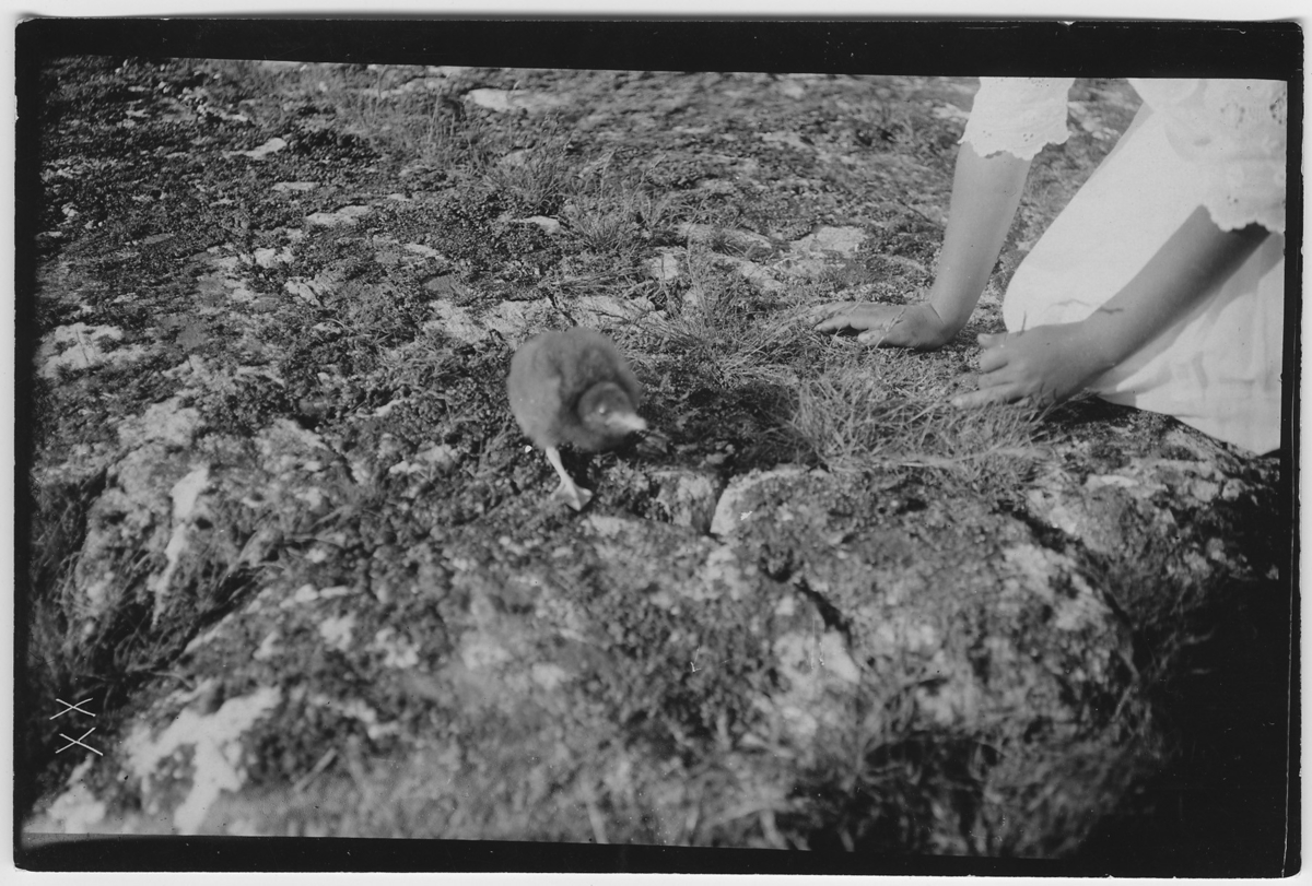 'Enligt bildtext 1 st ''dununge av labb, 14 dagar gammal.'' Närbild, en person delvis synlig i bilden. :: :: Se serie med fotonr. 468-475.'