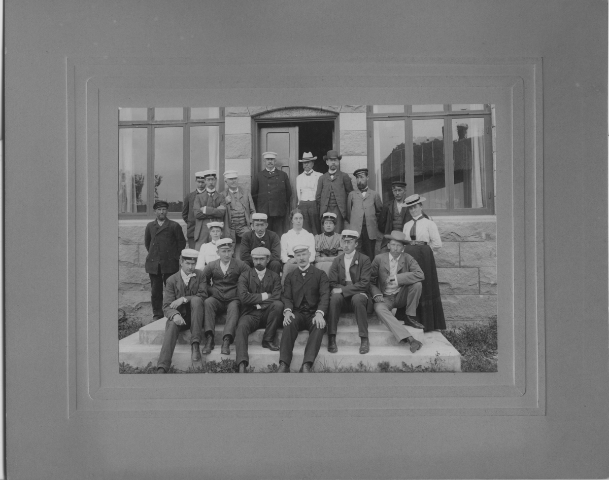 'Kristinebergs Zoologiska station. :: :: Gruppporträtt på trappan in till ett stenhus. 4 kvinnor 16 män. Iklädda studentmössor, hattar och skärmmössor. :: :: Ingår i serie med fotonr. 5103:1-24.'