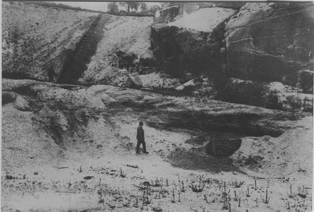 'Skalbanken mot öster, Stora skärningen i bakgrunden, den mindre 35 m längre fram i förgrunden. Sammanlagda mäktigheten över 12 m. En ståendes man mitt i bilden. :: :: Serie fotonr 4818-4828'