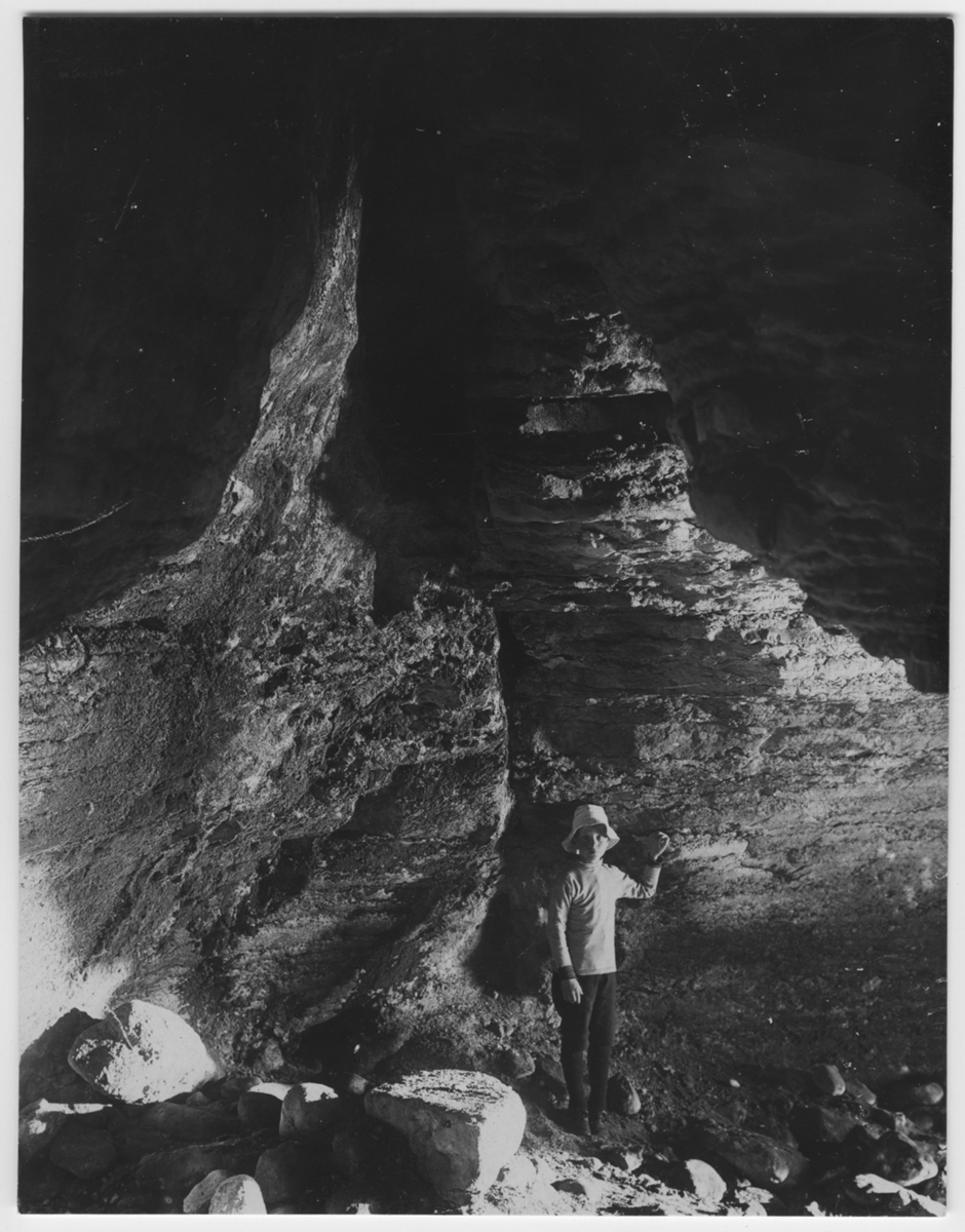 '1 barn står i en grotta. Ljus från grottöppning. :: :: Ingår i serie med fotonr. 4829-4838.'