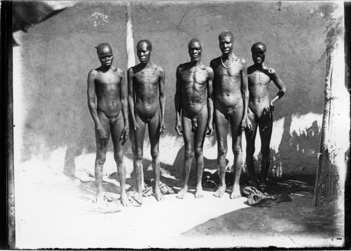'Diverse fotografier från bl.a. dåvarande Nordrhodesia, nu Zambia, tagna av Konsul Magnus Leijer. :: :: Fem nakna män med patologiska förändringar av könsorganen. Stående på rad axel mot axel vid en vägg.'