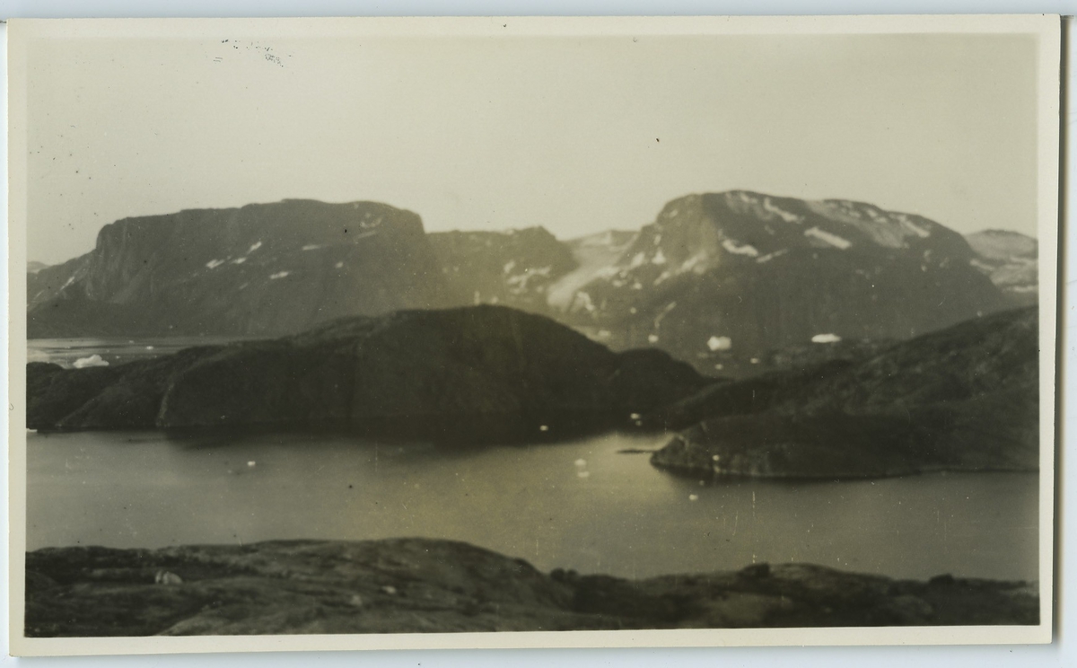 'Fuglehollet = fågelhålet som fortsätter som laguner (haff), separerad av låga bed rock. Lagun?, omgärdad av berg. :: :: Ingår i serie Fotonr. 5217:1-103. Se även hela fotonr. 5202-5218 med bilder från Frits Johansen.'