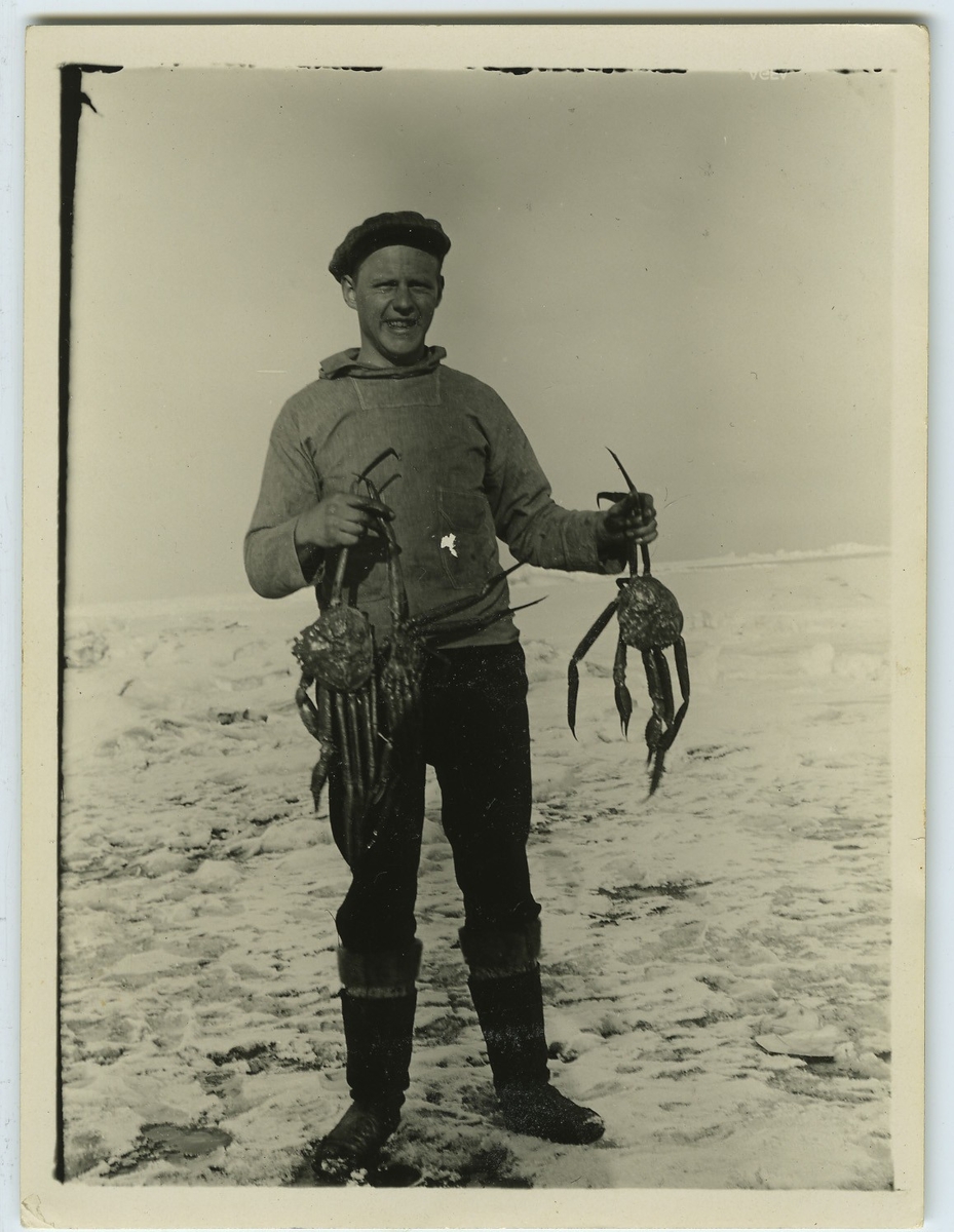 'Man som håller tre krabbor. :: Detta foto fick Frits Johansen av ingenjören Ejernees den 11 juli 1931. Fotogarfiet är taget i mitten av maj samma år (enligt dagboken). :: :: Ingår i serie Fotonr. 5217:1-103. Se även hela fotonr. 5202-5218 med bilder från Frits Johansen.'