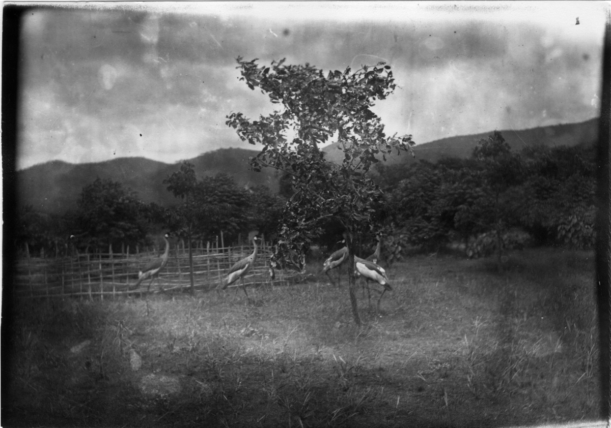 'Diverse fotografier från bl.a. dåvarande Nordrhodesia, nu Zambia, tagna av Konsul Magnus Leijer. :: :: Fem stora långa fåglar stående i gräs invid ett staket, framför dem även ett träd. I bakgrunden är ytterligare träd och berg synliga.'