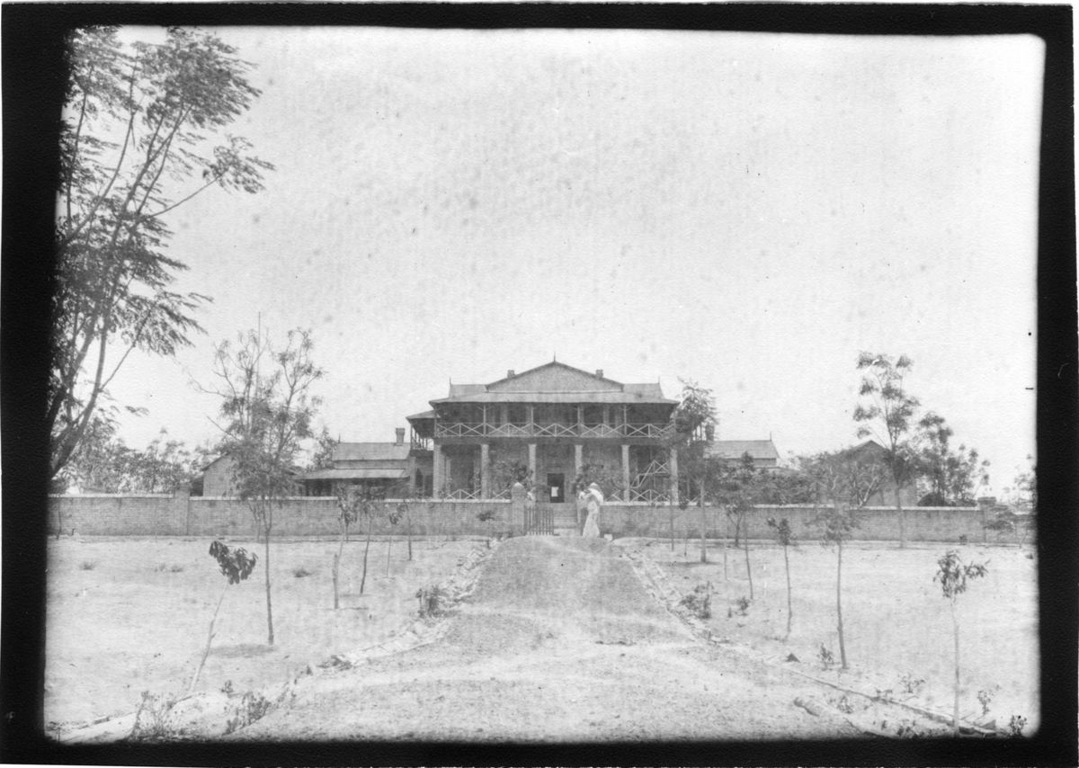 'Diverse fotografier från bl.a. dåvarande Nordrhodesia, nu Zambia, tagna av Konsul Magnus Leijer. :: :: Kvinna med parasoll ståendes vid port i stenmur inhängnande en större byggnad, fram till vilken en grusväg, m nyplanterade träd på var sida om den, leder.'