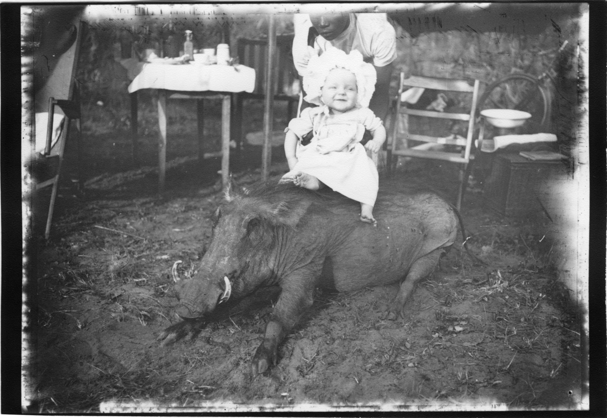 'Diverse fotografier från bl.a. dåvarande Nordrhodesia, nu Zambia, tagna av Konsul Magnus Leijer. :: :: 1 st kvinna håller fast 1 st bebis som sitter på ryggen på ett liggande vårtsvin. I bakgrunden, dukat bord, stolar, cykel etc.'