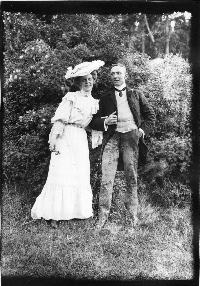 'Diverse fotografier från bl.a. dåvarande Nordrhodesia, nu Zambia, tagna av Konsul Magnus Leijer. :: :: En kvinna och en man i gräset framför ett buskage.'
