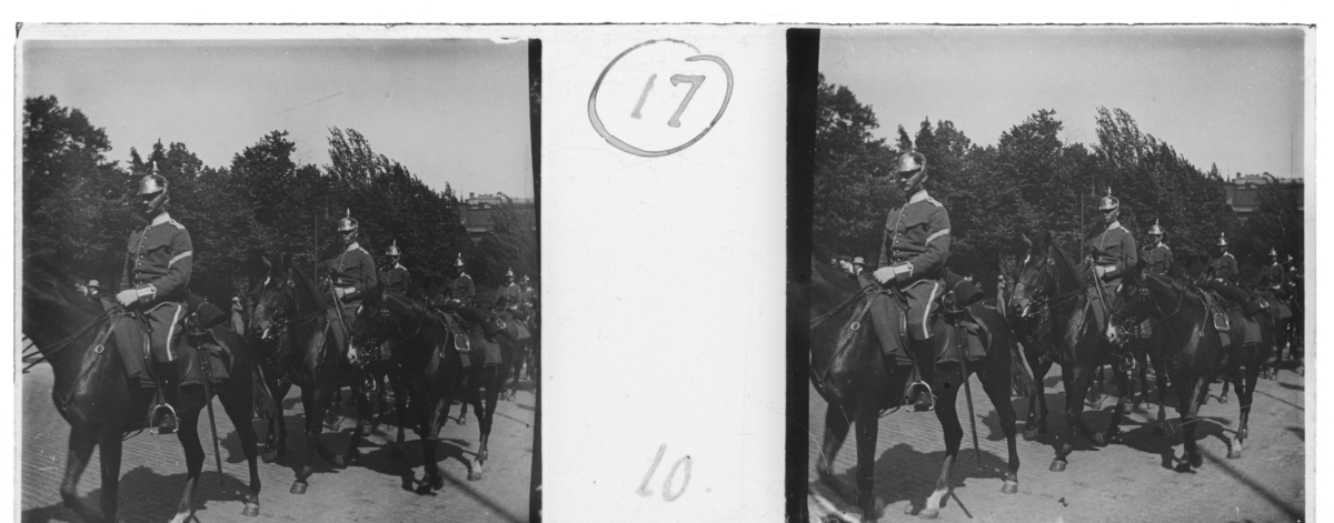 'Dragoner, beridna militärer i följd. Träd och byggnader på avstånd. Enligt text till fotot: ''Dragoons with led hourses.'' (Dragooner, beridna.) :: :: Ingår i serie med fotonr. 5246:1-17, se även hela serien med fotonr. 5237-5267.'