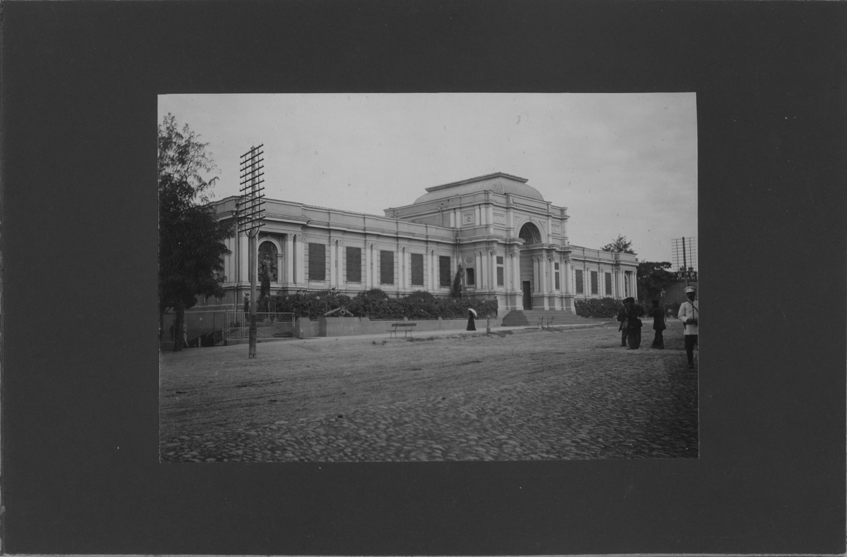'Vy med människor, kvinnor, män gående framför stor byggnad. 1 man i uniform. Framför byggnaden ev. kanoner och elstolpar. :: :: Ingår i serie med fotonr. 5288:1-30. Se även fotonr. 5269-5292 med bilder från Stuxbergs resa till Kaukasien.'