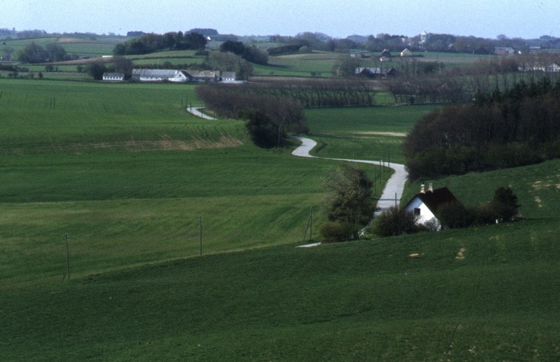 'Jordbruksmarker och på avstånd hus. :: :: Fotonr. 5445 består av totalt 226 diabilder där enstaka har skannats. Bilderna är fördelade på 13 hängmappar och det finns bildförteckning finns för ca 100 st.'