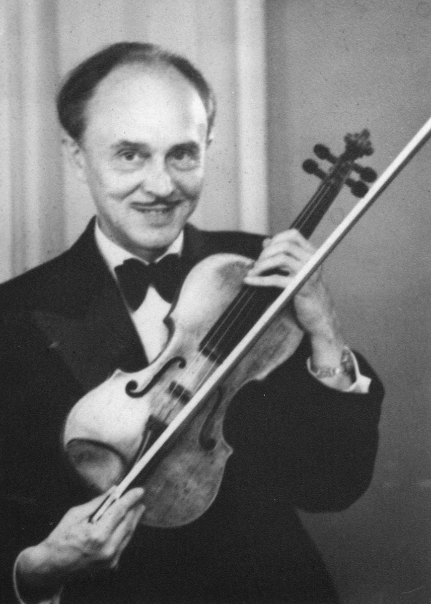 'Porträtt på Josef ''Pepi'' Schulz med fiol. :: Han arbetade på museet från 1925 till 1963, med fjärilar. :: Född 1885-02-12 död 1963-03-00.'