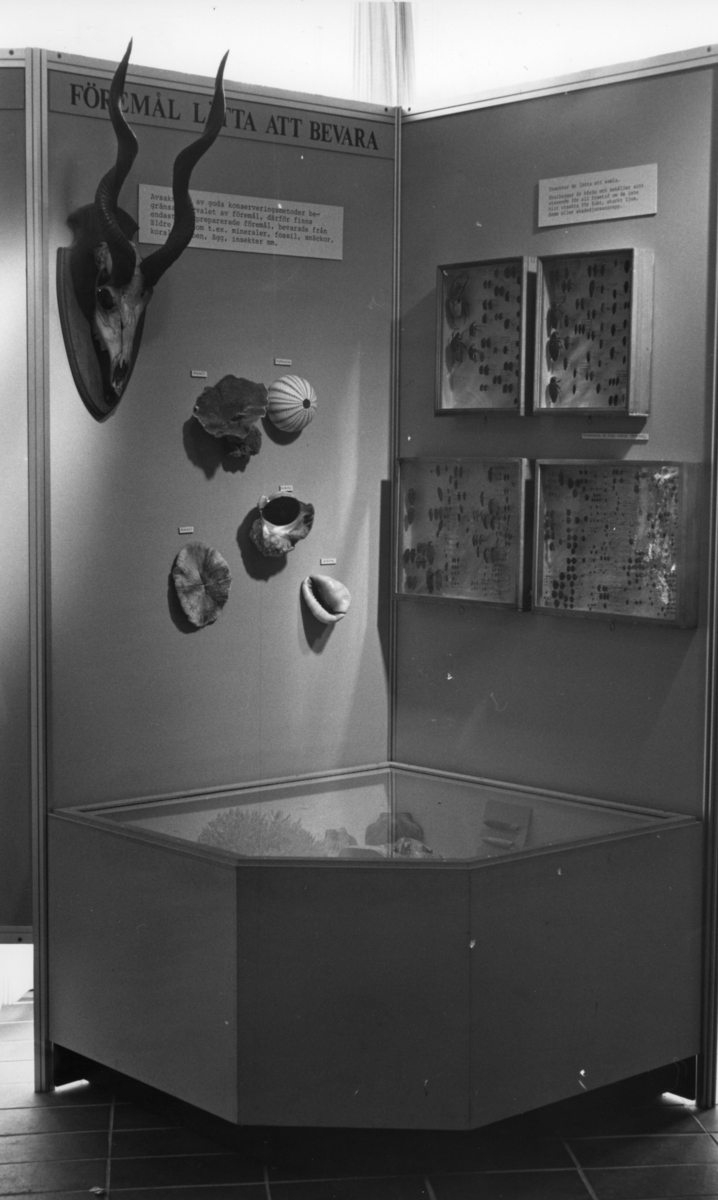 'Foto på Jubileumsutställningen, Göteborgs Naturhistoriska museum 150 år. :: :: Utställningsskärmar + låda som belyser vad som historiskt har kunnat bevarats och vad som inte har kunnat bevarats. Insekter i montrar, horn, koraller, snäckor och sjöborre. :: :: Horn: Coll.au. 7427.'