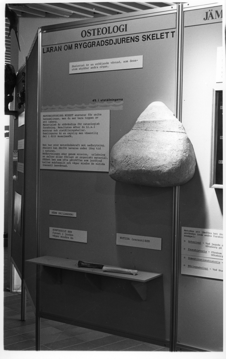 'Foto på Jubileumsutställningen, Göteborgs Naturhistoriska museum 150 år. :: :: Utställningsskärm angåeden osteologi. Med text om Götebrogs Naturhistoiska museums bensamlingar exemplifierat med subfossilt ben samt recent ben.'