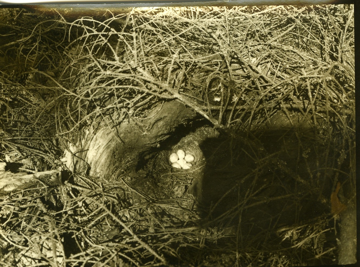 'Rödhake, bo med 6 ägg, :: :: Äggens naturliga storlek: :: Längd:21 mm :: Tjocklek:15 mm :: :: Ingår i serie med fotonr. 586-595.'