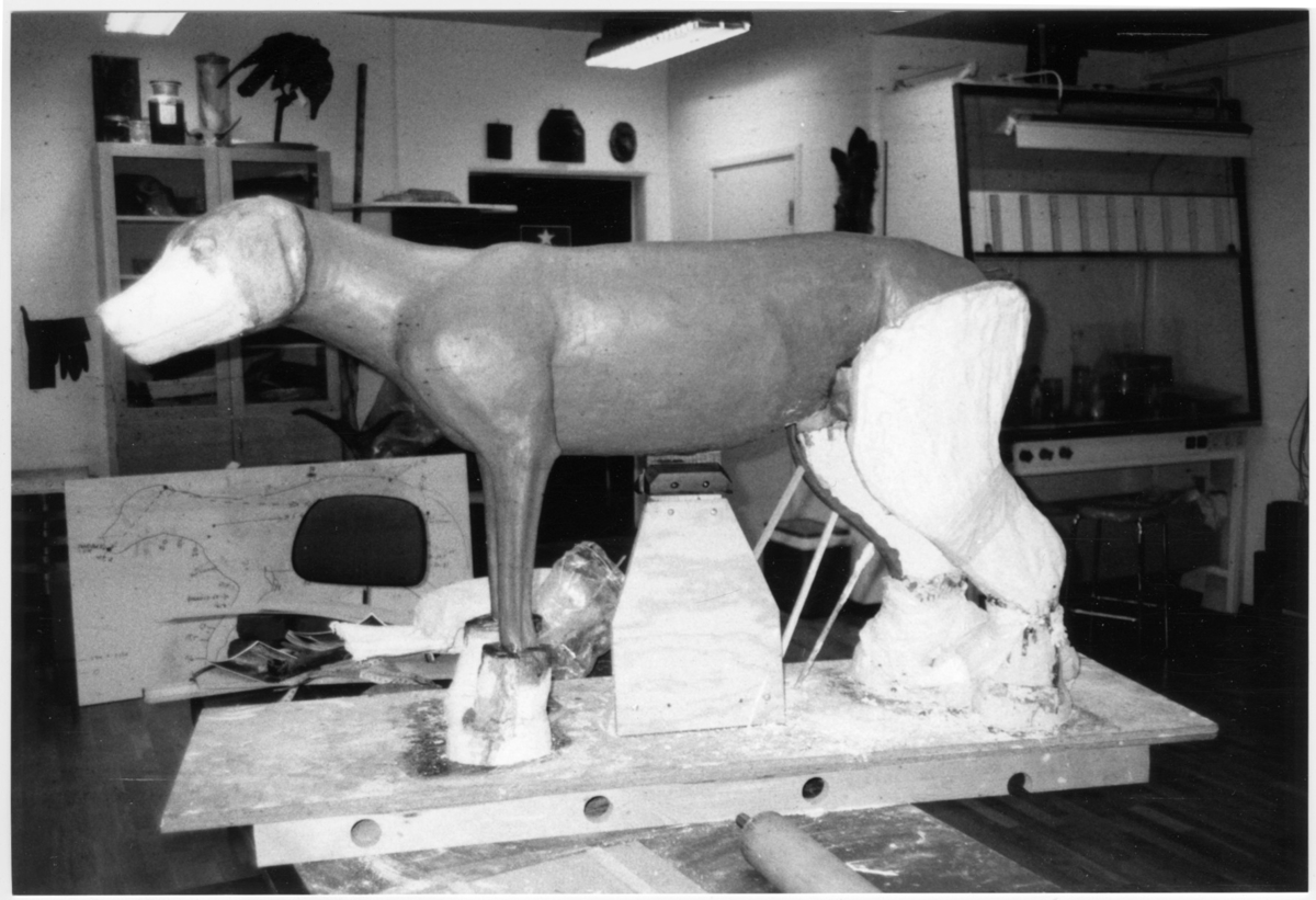 'Montering av varg: :: Arbetet med gipsnegativet påbörjat, lermodellen för monteringen av vargen delvis klädd med gips. Sedd från sidan. I bakgrunden dragskåp och skåp med glasdörrar. I bakgrunden även skissen synlig. :: :: Ingår i serie med fotonr. 6926:1-11: Konservator Åke Melin monterar den s.k. Mölndalsvargen, en ung varghane, som inkom till Göteborgs Naturhistoriska museum 1992-05-28. Coll.an: 14836. Montaget finns (06-06-21) i däggdjurssalen på Göteborgs Naturhistoriska museum.'