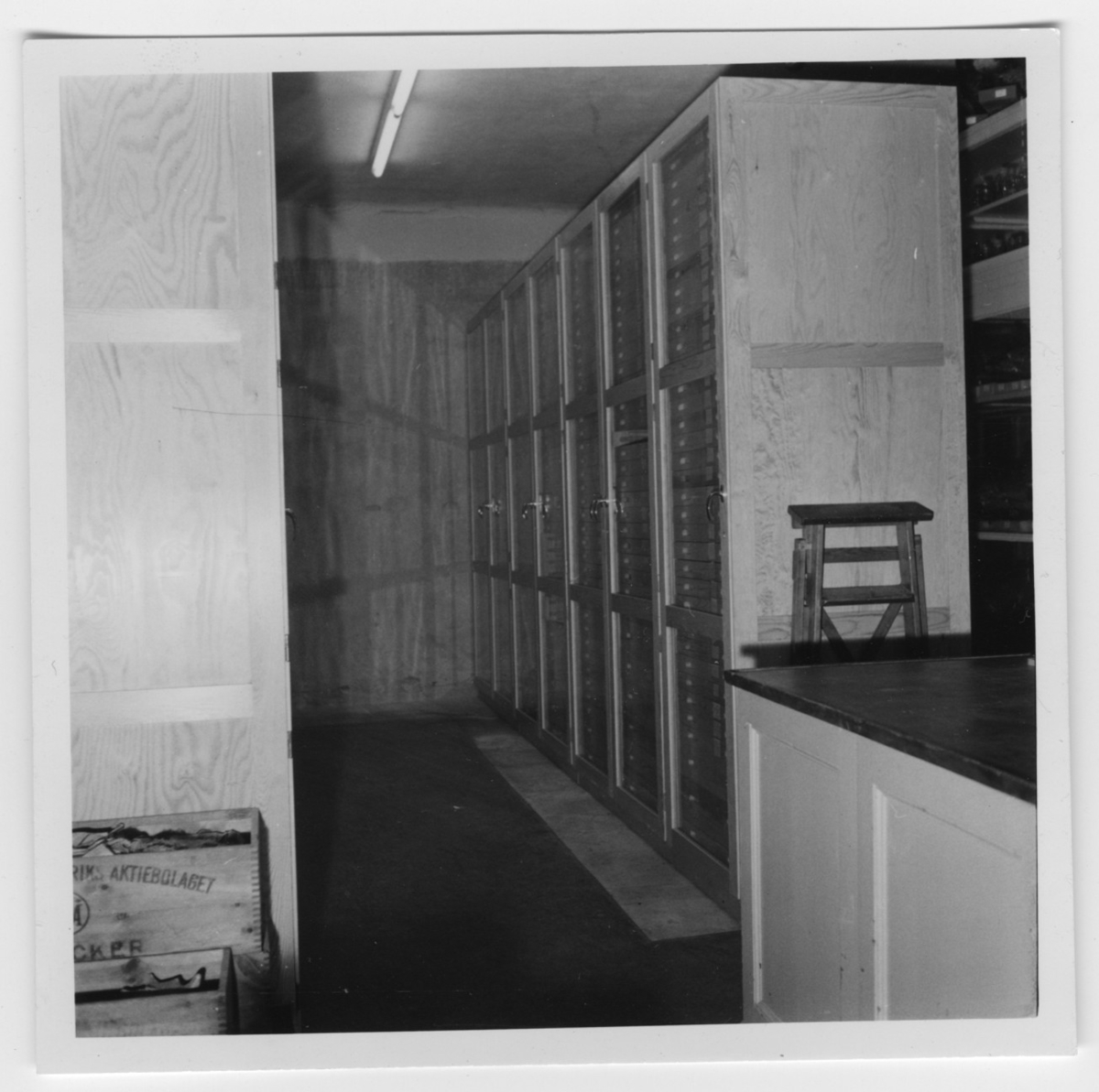 'Skåp med lådor i magasin. Snäckskåp i gamla magsinet :: :: Ingår i serie med fotonr. 6964:1-11.'