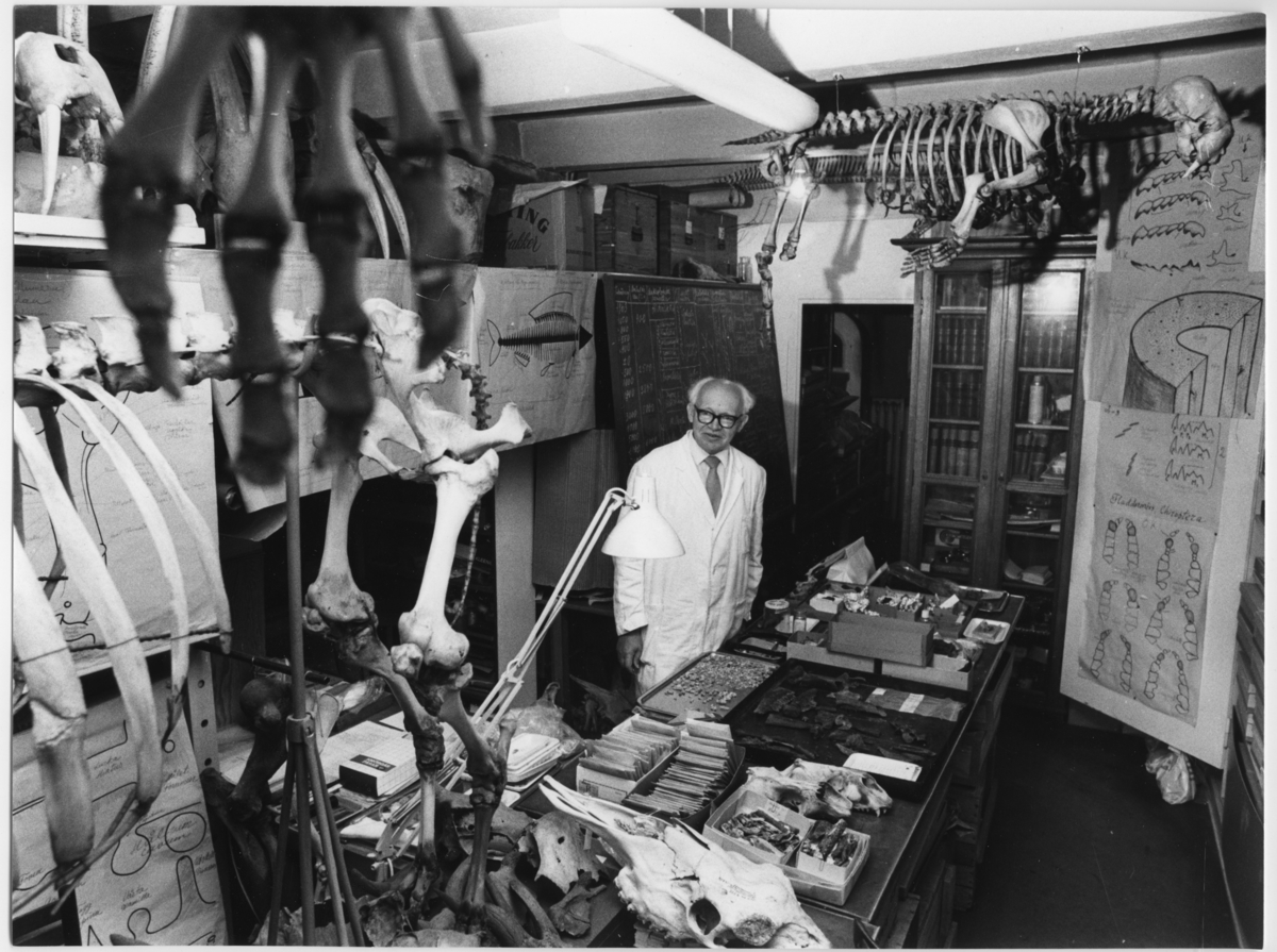Johannes Lepiksaar stående vid arbetsbänk i benmagasin. Skelett hängande i taket. Benkällaren.