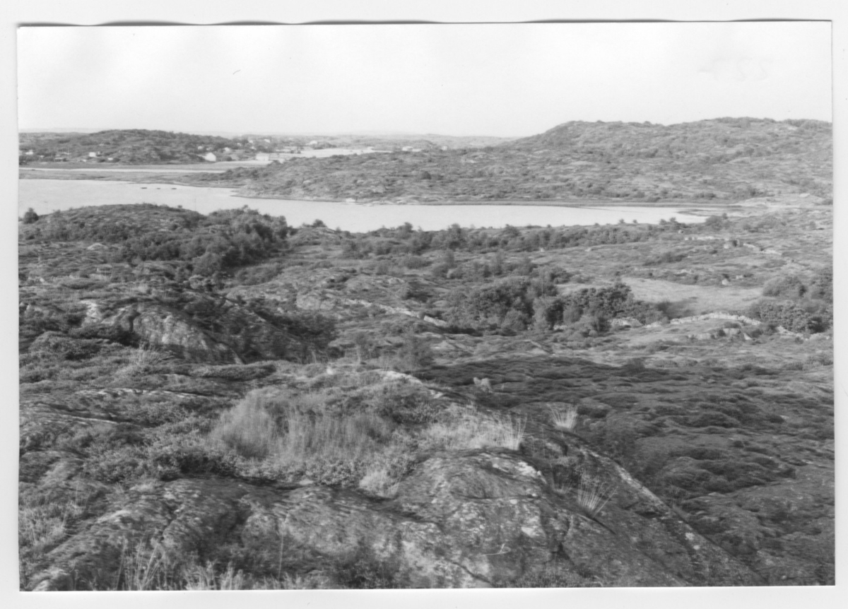 'Bildtext: ''Havsvik. Riktning 50.'' :: Vy över berghällar ner mot havsviken, hällarna bevuxna med träd och buskar, stenmur dragen ner mot vattnet. Stengärdesgård. :: :: Ingår i serie med fotonr. 6970:1-1125, dokumentation av Hisingens naturgeografi, visande landskapsformerna i stora drag och gjord inför exploateringen av området. Platserna för fotograferingen finns utsatta på karta i skala 1:4000 som finns på Göteborgs Naturhistoriska musem. Fotoriktningen mättes med kompass i gammalgrader.'