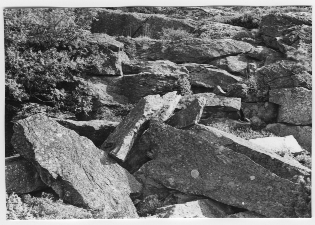 'Bildtext: ''Nyligen lossprängda och nedrasade block. Riktning 34.'' :: Närbild på hög med kantiga stenblocken. :: :: Ingår i serie med fotonr. 6970:1-1125, dokumentation av Hisingens naturgeografi, visande landskapsformerna i stora drag och gjord inför exploateringen av området. Platserna för fotograferingen finns utsatta på karta i skala 1:4000 som finns på Göteborgs Naturhistoriska musem. Fotoriktningen mättes med kompass i gammalgrader.'