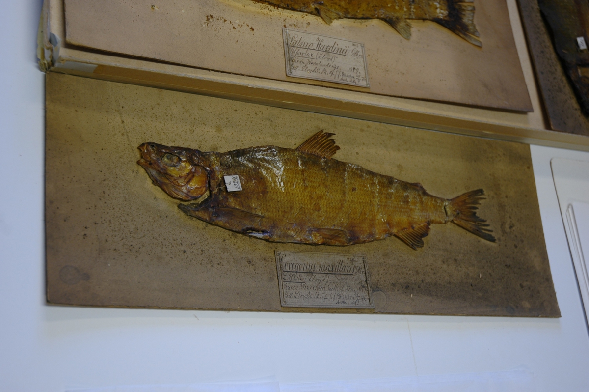 'Torkat skinn av storsik från Vänern år 1857 Pi.su. nr 1024. :: :: Ingår i serie med fotonr. 7005:1-8 med foton av fiskar bevarade genom torkning, framtagna för rengöring av konservator.'