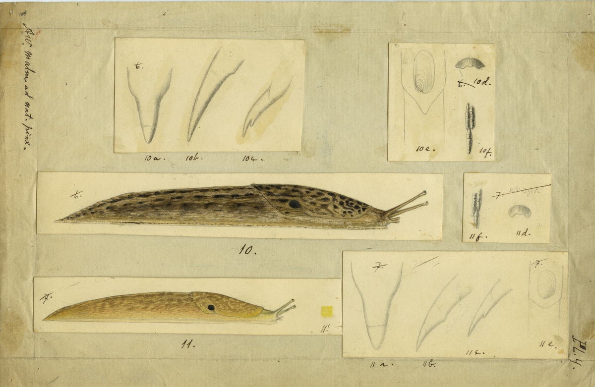 'Ark med diverse skisser, foton? och teckningar av sniglar. :: :: Ingår i serie med fotonr. 6993:1-5 med originalteckningar och foton på sniglar av August Wilhelm Malm.'
