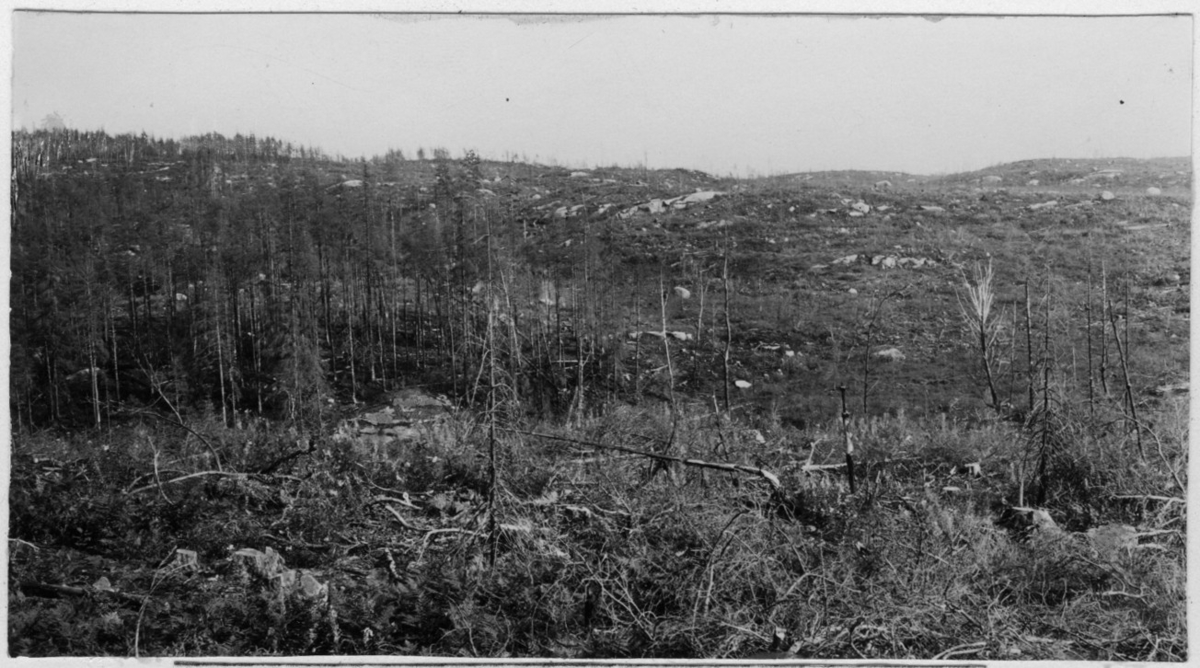 'Bildtext: ''Efter skogsbrand år 1925.'' Vy över brandhärjat skogsbestånd. :: :: Fotonr. 7047:2-23 indelad under rubriken ''Atmosfäriska skador på skogen, skogseld och släckning därav.'' Ingår i serie med fotonr. 7046:1-383, 7047:1-33 och 7048:1-67 med bilder från Länsjägmästare John Lindners bildarkiv.'