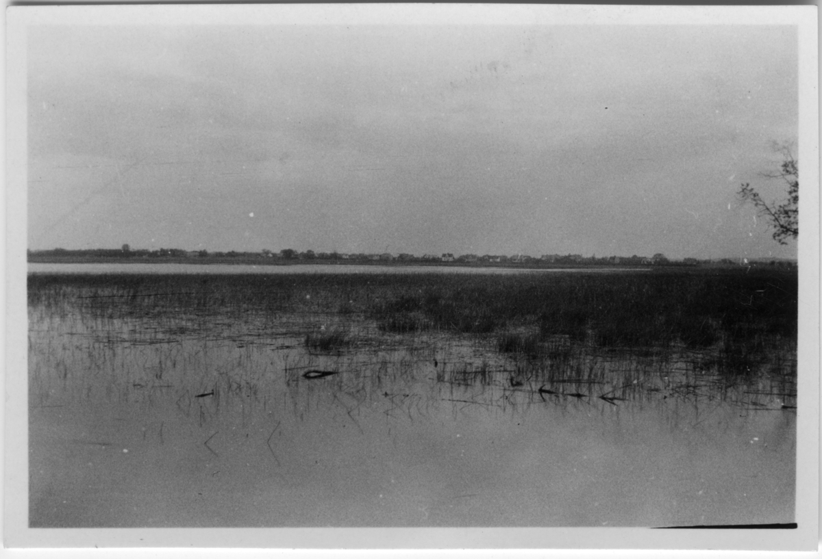 'Bildtext: ''I bakgrunden västra stranden av Hammarsjön. Kortet taget från östra stranden.'' :: :: Vy över sjön med vassvegetation i förgrunden, på andra sidan stranden syns hus. :: :: Ingår i serie med fotonr. 7089:1-15'