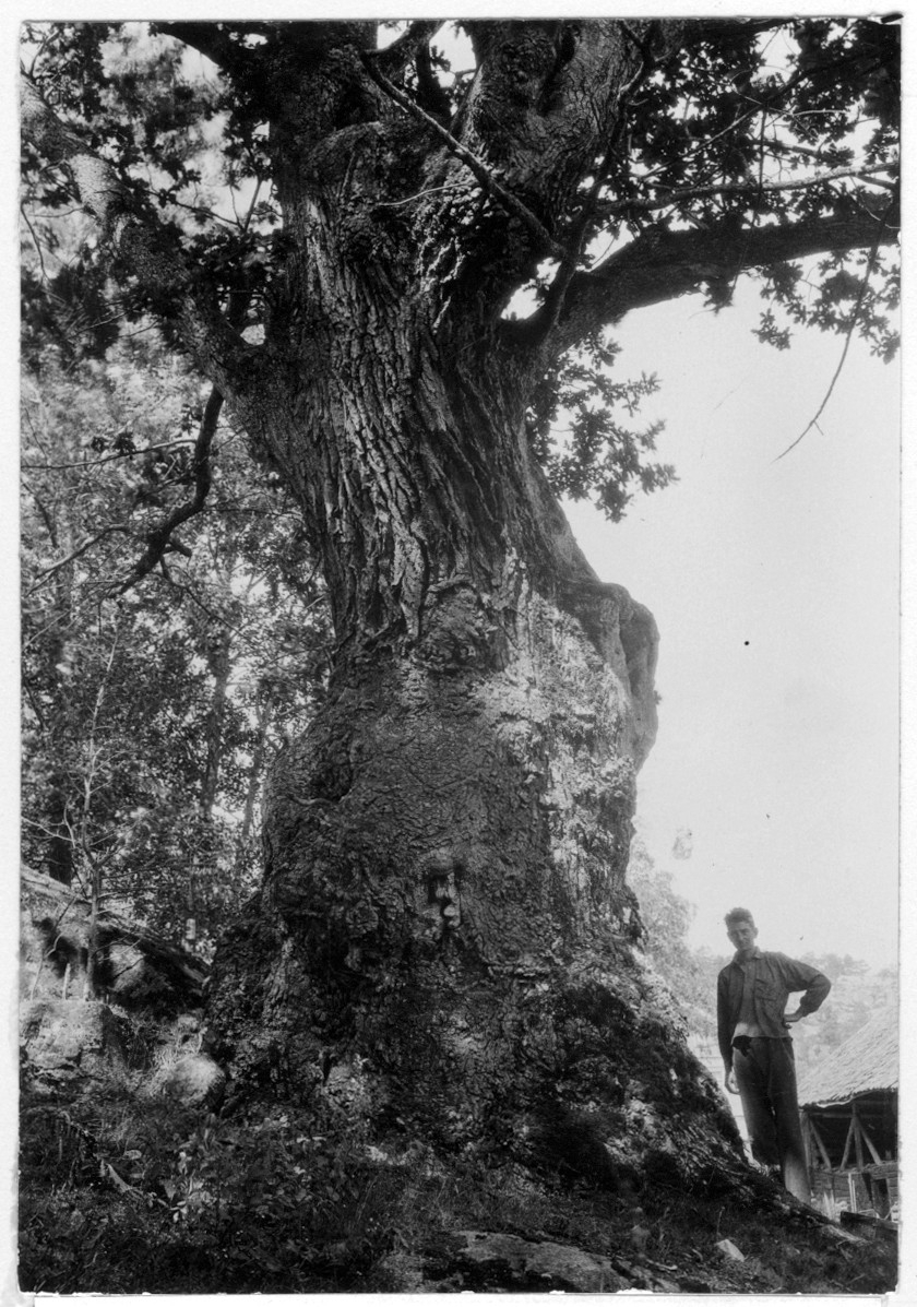 'Bildtext: ''Bild 222. Ek. Diameter vid brösthöjd 230 cm, närmare marken 3 meter.'' 1 man stående invid eken. Byggnad i fonden. :: :: Fotonr. 7046:119-185 indelade som ''Märkvärdiga träd i Göteborgs län och Bohus län''. Ingår i serie med fotonr. 7046:1-383, 7047:1-33 och 7048:1-67 med bilder från Länsjägmästare John Lindners bildarkiv.'