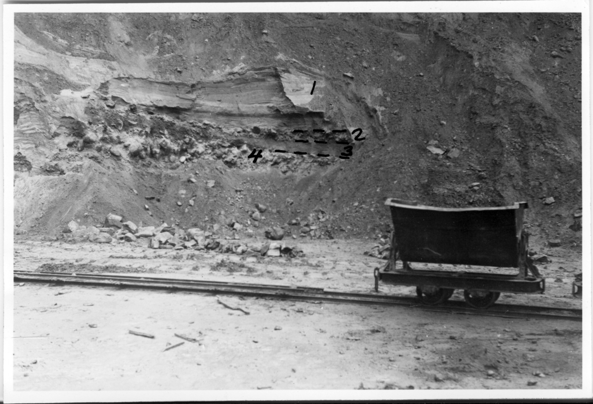 'Närbild på liten vagn på rälsspår framför vägg i grustaget. Bildtext: ''Öster om stora vecket.'' Moränens lagerföljd markerade. :: Markeringar på bilden, :: ''1) Gula sanden :: 2) Steniga grå sanden :: 3) Grå sanden, fortsätter ej inåt, var försvunnen vid besöket den 25/11.'' :: :: Ingår i serie med fotonr. 7058:1-32.'