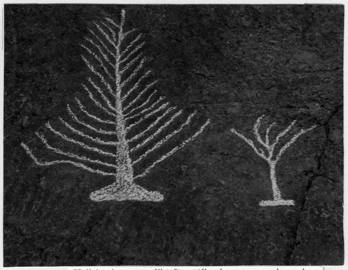 'Bildtext: ''Hällristning, sannolikt föreställande en gran och en ek. Omedelbart under granen syns en del av ett skepp med besättning.'' :: :: Fotonr. 7048:38-41 indelad under rubriken ''Skogens historia i sydvästra Sverige under förhistorisk tid''. Ingår i serie med fotonr. 7046:1-383, 7047:1-33 och 7048:1-67 med bilder från Länsjägmästare John Lindners bildarkiv.'