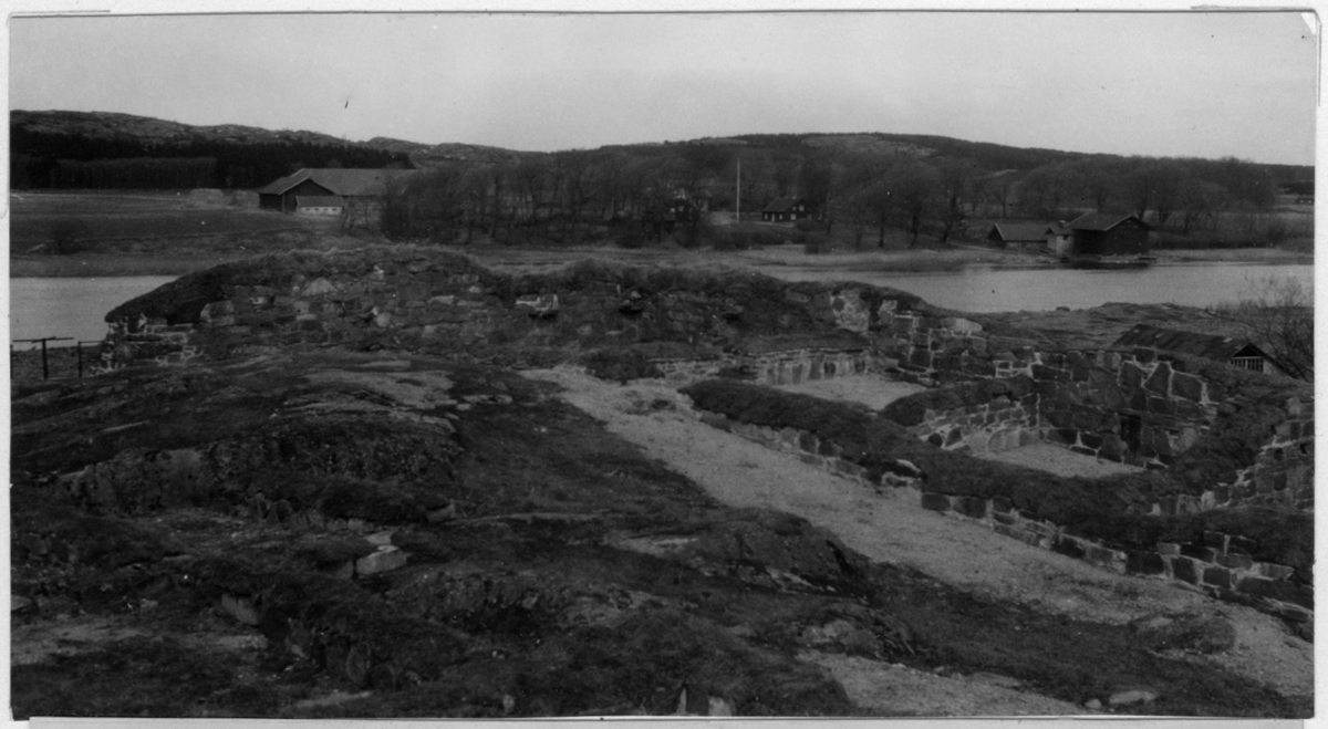 'Bildtext: ''Platsen för Konghelle (Kastellgården i Ytterby socken) sedd från Ragnhildsholmens fästningsruin.'' Vy över ruin med stenmurar. I bakgrunden gårdsbyggnader. :: :: Fotonr. 7048:42-46 indelad under rubriken ''Skogens historia i Göteborgs och Bohus län under historisk tid''. Ingår i serie med fotonr. 7046:1-383, 7047:1-33 och 7048:1-67 med bilder från Länsjägmästare John Lindners bildarkiv.'