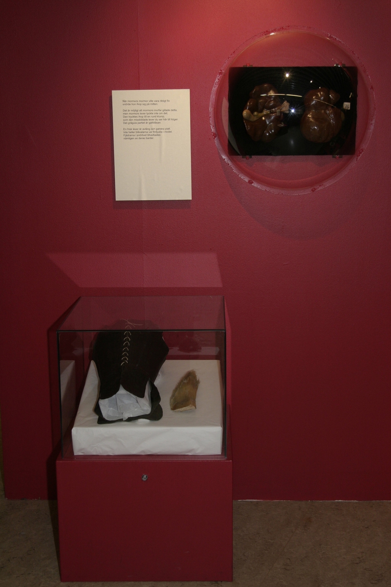 'Motiv från ''I LOVE U''-utställningen som fanns utställd på Göteborgs Naturhistoriska Museum under perioden 2006-06-06 t.o.m. 2007-09-02. :: :: Del av rödmålad vägg, glasmonter med korsett och på väggen modeller av lever deformerad av korsettanvändande. :: :: Ingår i serie med fotonr. 7066:1-19.'