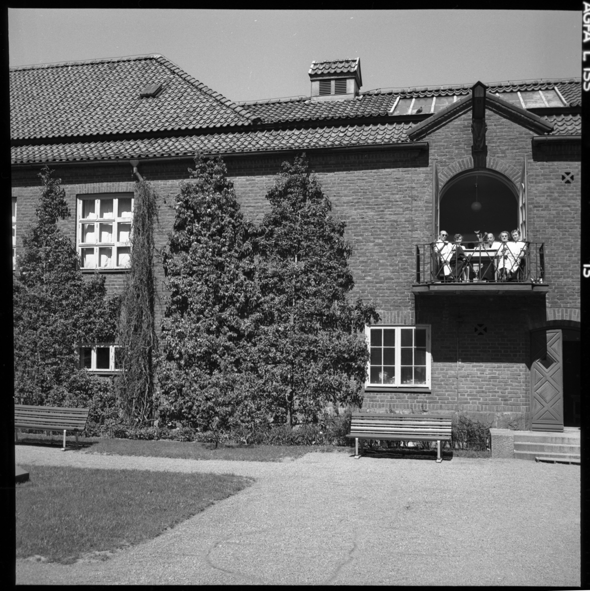 'Vy över del av innergården med träbänkar, sett mot konservatorsateljen med takluckan synlig ovanför balkongen . På balkongen sitter en grupp människor, män och kvinnor, personal på museet vid ett bord på balkongen. Från vänster till höger, Björn Wennerberg, ?, Viking Fontaine?, Elisabet Tobiaeson och Ingeborg Levinsson. 3 kvinnor och 2 män. Till vänster om balkonger höga spaljeade päronträd invid väggen. :: :: Ingår i serie med fotonr. 7120 med diverse bilder från Hans Lohmander.'