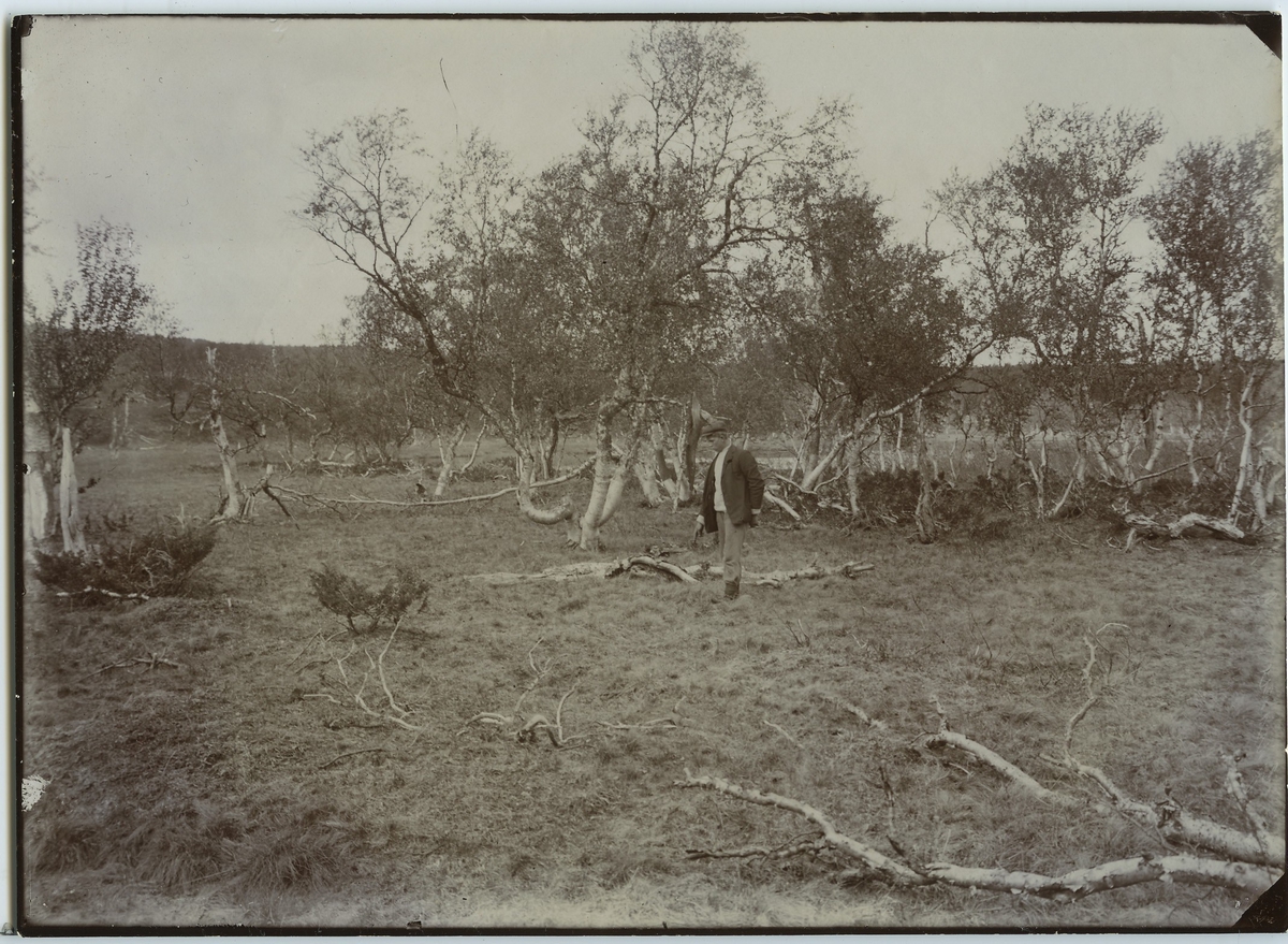 'Häckningsplatsen för beckasinen. 1 man står och pekar ner i gräset. Björkdunge i bakgrunden. :: :: Se fotonr. 117-121. :: :: Ingår i serie med fotonr. 106-127.'