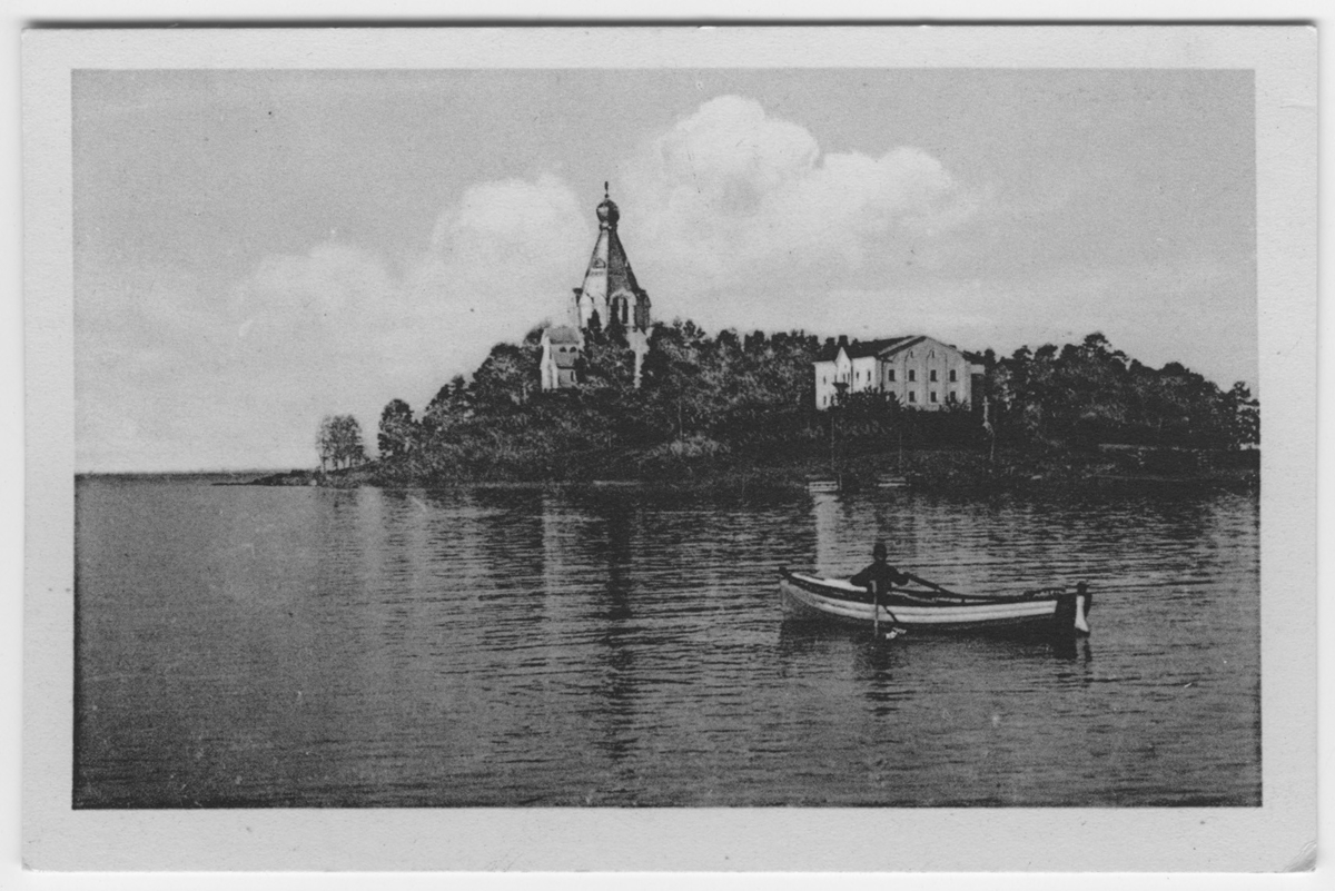 'Valamo, kapellet vid sjön. Vy från Ladogasjön in mot Valamo klostret. Eka med 1 person i förgrunden. :: :: Ingår i serie med fotonr. 1190-1200, inköpta av Leonard Axel Jägerskiöld sommaren 1927.'