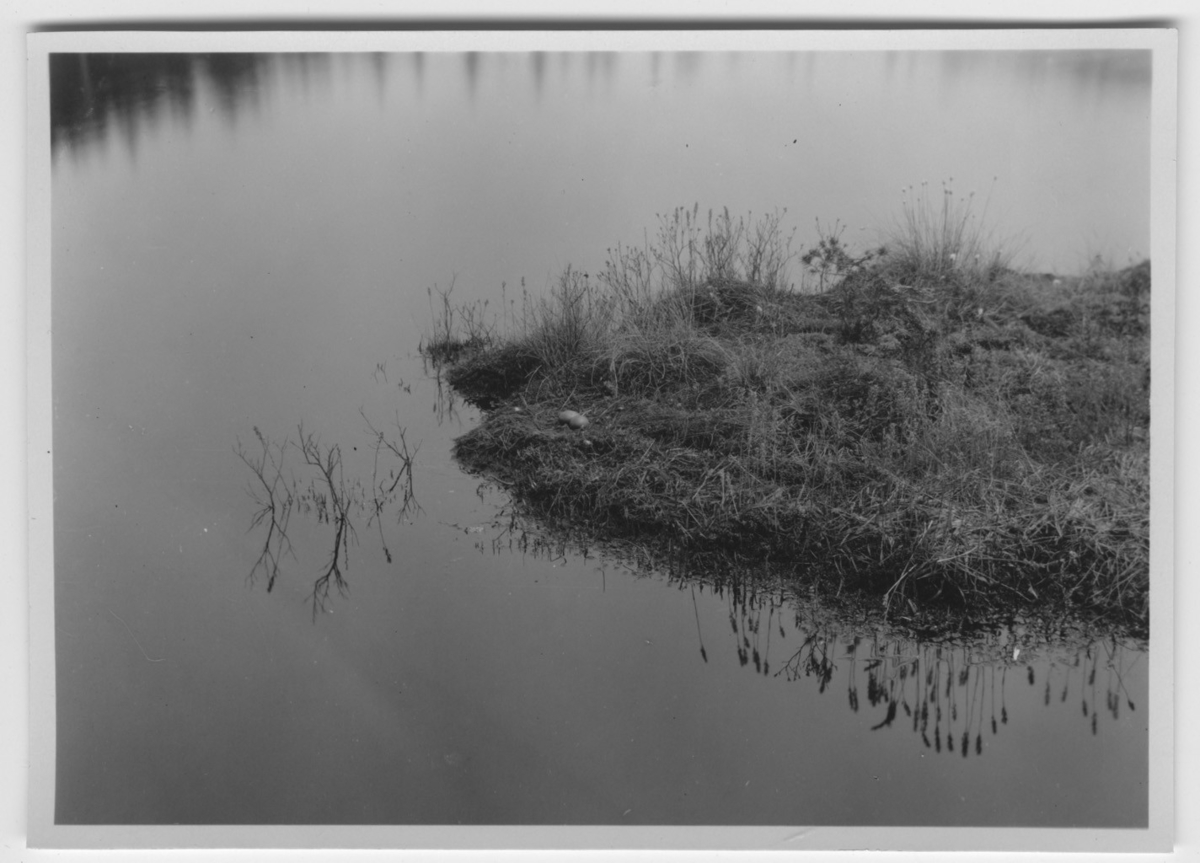 'Smålommens häckningsplats i en tjärn i Hindåstrakten, vy med bo av smålom med ägg synligt. :: :: Se serie med fotonr. 1258-1304.'