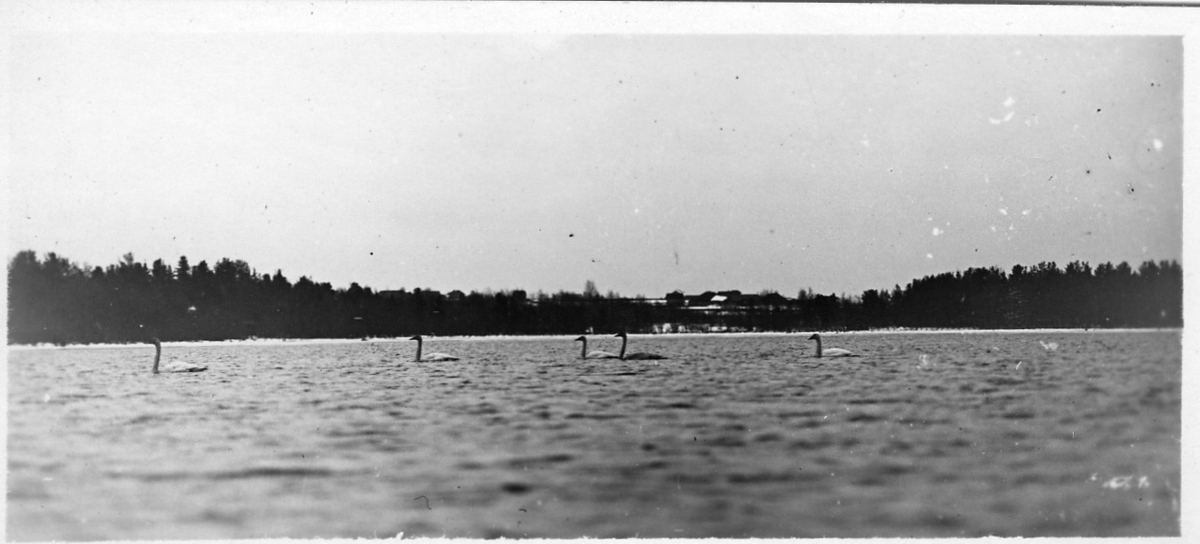 'Sångsvanar i vatten. Vy över vattnet och in mot land med skog och bebyggelse. :: :: Serie fotonr 953-971.'