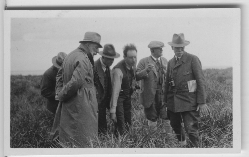 'Göteborgs Biologiska förenings utfärd till Måkläppen och Falsterborev: :: :: 6 män samlade kring något som de tittar på. Högt gräs omkring. Leonard Axel Jägerskiöld andre från höger. :: :: Se fotonr. 1384-1395, 1618-1639, 1640-1648 samt 3229 från samma utfärd.'