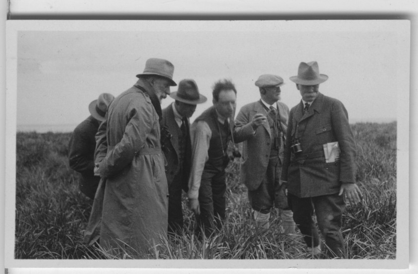 'Göteborgs Biologiska förenings utfärd till Måkläppen och Falsterborev: :: :: 6 män samlade kring något som studeras. Högt gräs omkring. Leonard Axel Jägerskiöld andra från höger. Samma motiv som fotonr. 1391. Kläder. Klädsel. Iklädda kikare. :: :: Se fotonr. 1384-1395, 1618-1639, 1640-1648 samt 3229 från samma utfärd.'