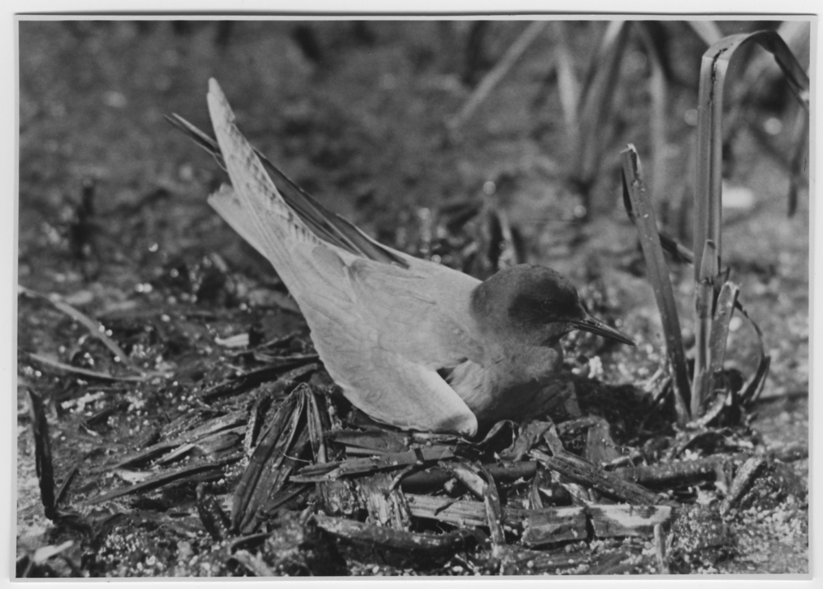 'Svarttärna på boet. :: Text enligt fotot: ''Svarttärna, samma hanne som fotonr. 2292 men på den bilden med de rätta nyanserna.'' ''Bilden visserligen tagen med pankromatisk plåt men utan gulskiva,varför nyanserna är ljusare än i verkligheten''. Se även fotonr. 2285 troligen samma motiv. :: :: Ingår i serie med fotonr. 2272-2304.'
