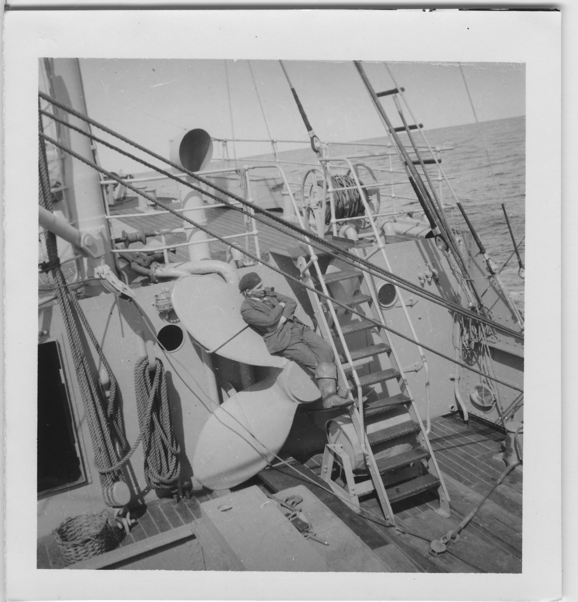 '''Skageraks''expedition 6-10 juni 1939: :: :: Dr Hans Höglund röker pipa, liggande mot propellern på Skageraks fördäck. Båtens exteriör. Mössa. Stövlar. Korg. :: :: Ingår i serie fotonr. 4100:1-10.'