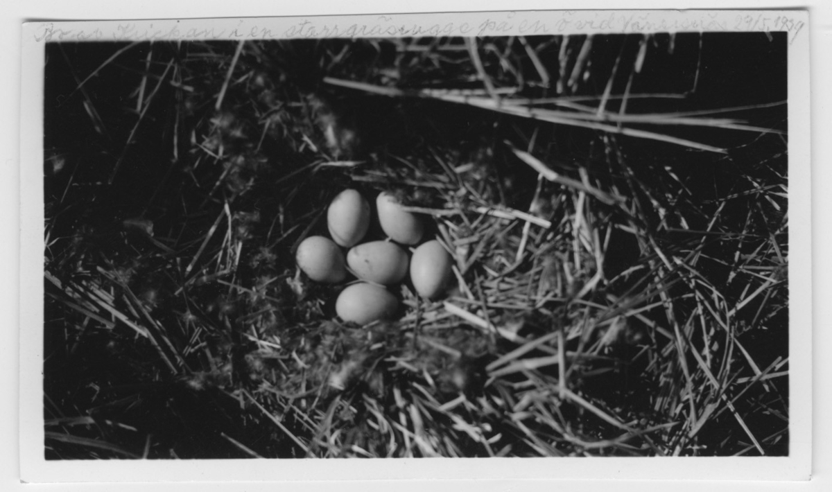 'Kricka, bo med 6 ägg. Text på fotot: ''Bo av krickan i en starrgräsrugge på en ö vid Vänersnäs.'' :: :: Ingår i serie med fotonr. 4140-4158.'