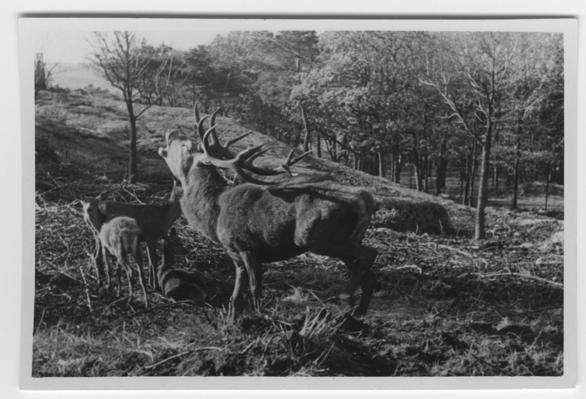 '3 st kronhjortar, varav 1 tjur sedd från sidan i förgrunden. Hane. :: :: Ingår i serie med fotonr. 4159:1-7 samt 4160:1-5.'