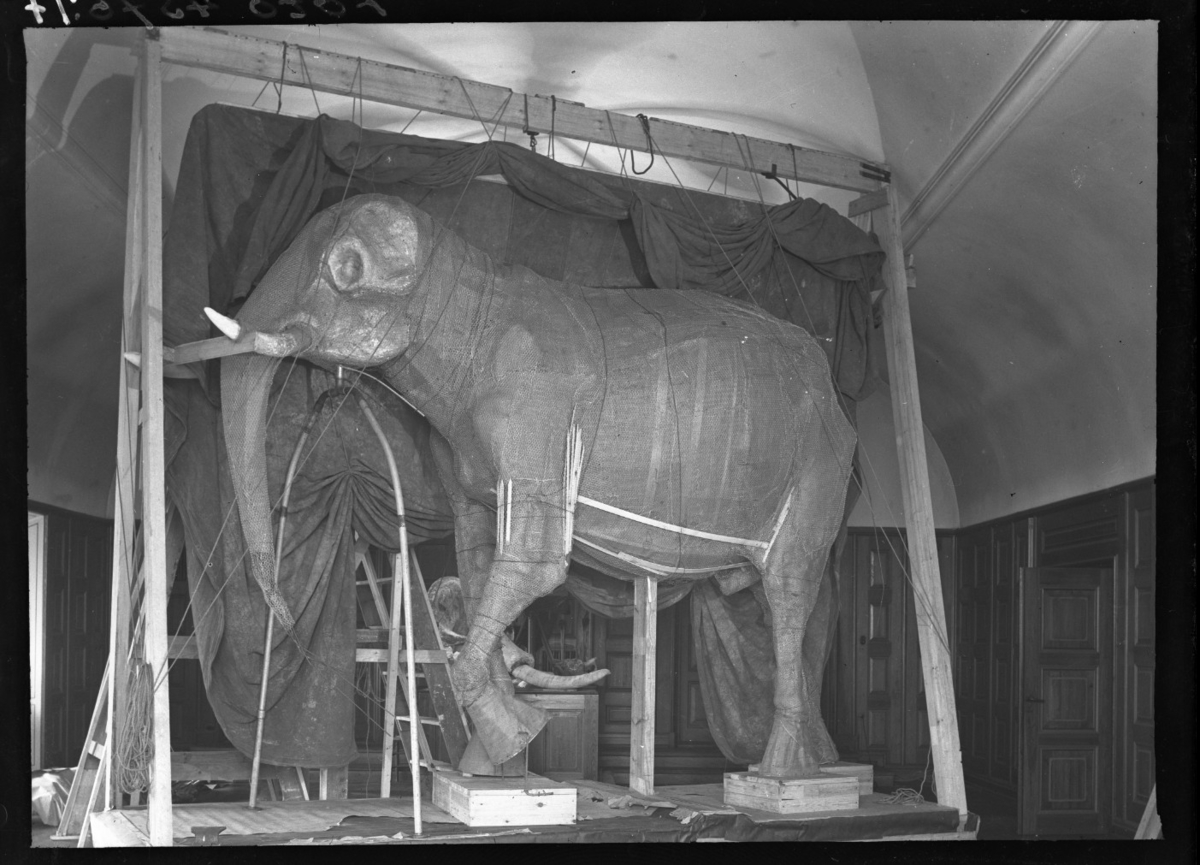 'Monteringen av Göteborgs Naturhistoriska museums elefant, från Angola. :: :: Grundstommen med ''öppen centralbräda'' är nu täckt av finmaskigt ståltrådsnät vilket senare kommer att täckas av lerlager för att bilda lerformen. :: :: Fynddatum: 1948-12-04. Elefanten skjuten och monterad av David Sjölander. :: :: Elefanten finns utställd på Göteborgs Naturhistoriska Museum i däggdjurssalen. :: :: Ingår i serie med fotonr. 4576:1-18.'