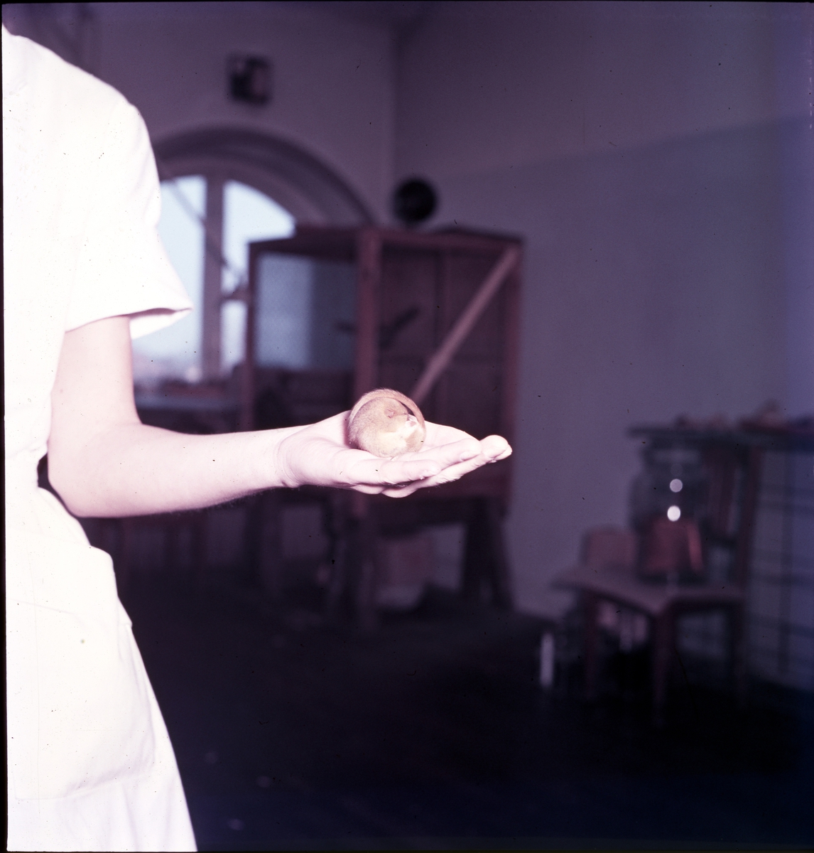 'Hasselmus. Fynddatum 1956-11-15, död på museet 1957-05-03. Hasselmusen ligger i en människorhand. I bakgrunden stol, ev, bur och fönster med välvd övre del. :: :: Se även fotonr. 4680:2.'