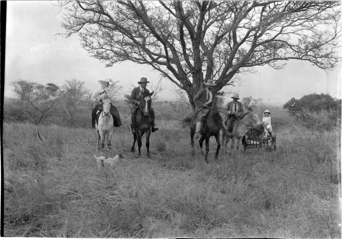 'Diverse fotografier från bl.a. dåvarande Nordrhodesia, nu Zambia, tagna av Konsul Magnus Leijer. :: :: 1 kvinna och 2 män till häst, på ett fält, samt en man sittandes på en åsna (?), bakom honom är en flicka i ståendes i en säng, synlig.'