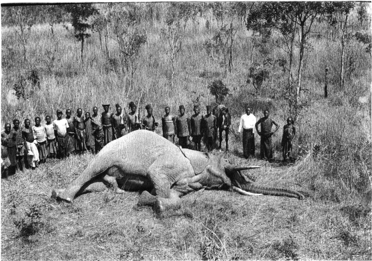 'Diverse fotografier från bl.a. dåvarande Nordrhodesia, nu Zambia, tagna av Konsul Magnus Leijer. :: :: 22 män och pojkar på rad bakom en fälld elefant, 2 stycken med gevär, en med häst.'