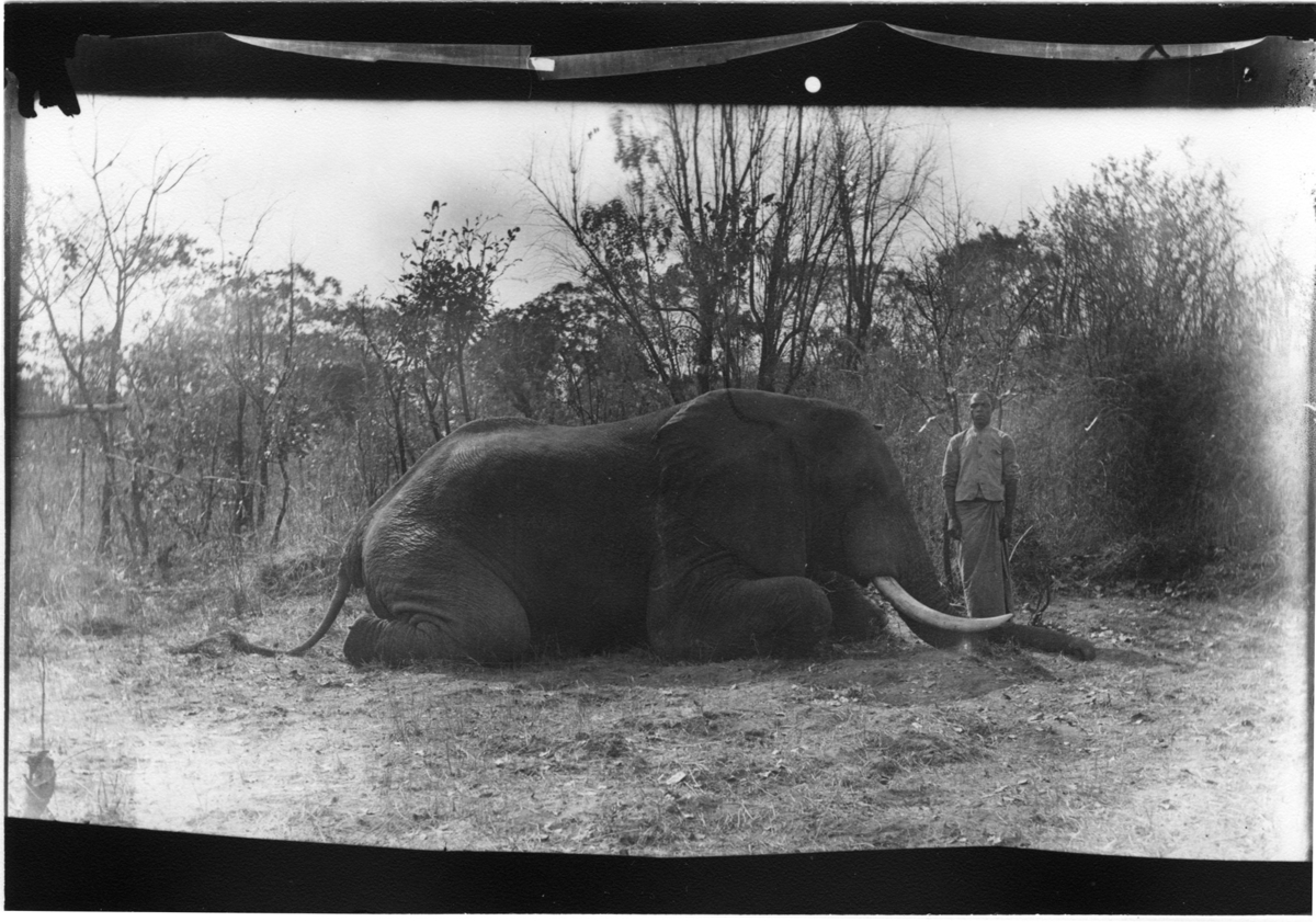 'Diverse fotografier från bl.a. dåvarande Nordrhodesia, nu Zambia, tagna av Konsul Magnus Leijer. :: :: En man stående vid en knäande elefant. I bakgrunden, träd och sly.'