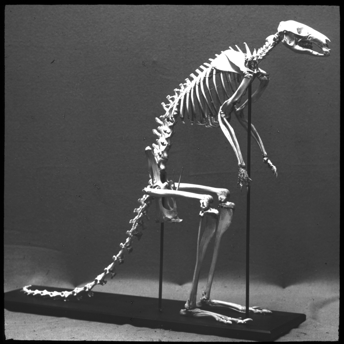'Skelett av kängurudjur. :: :: Från Dr. Schlüter & Mass, Halle a S naturvetens. Läromedel. Numrerade Serie I.A. Nr 1-30. :: :: Ingår i serie med fotonr. 5374:1-30. Se även hela fotoserien 5374-5376.'