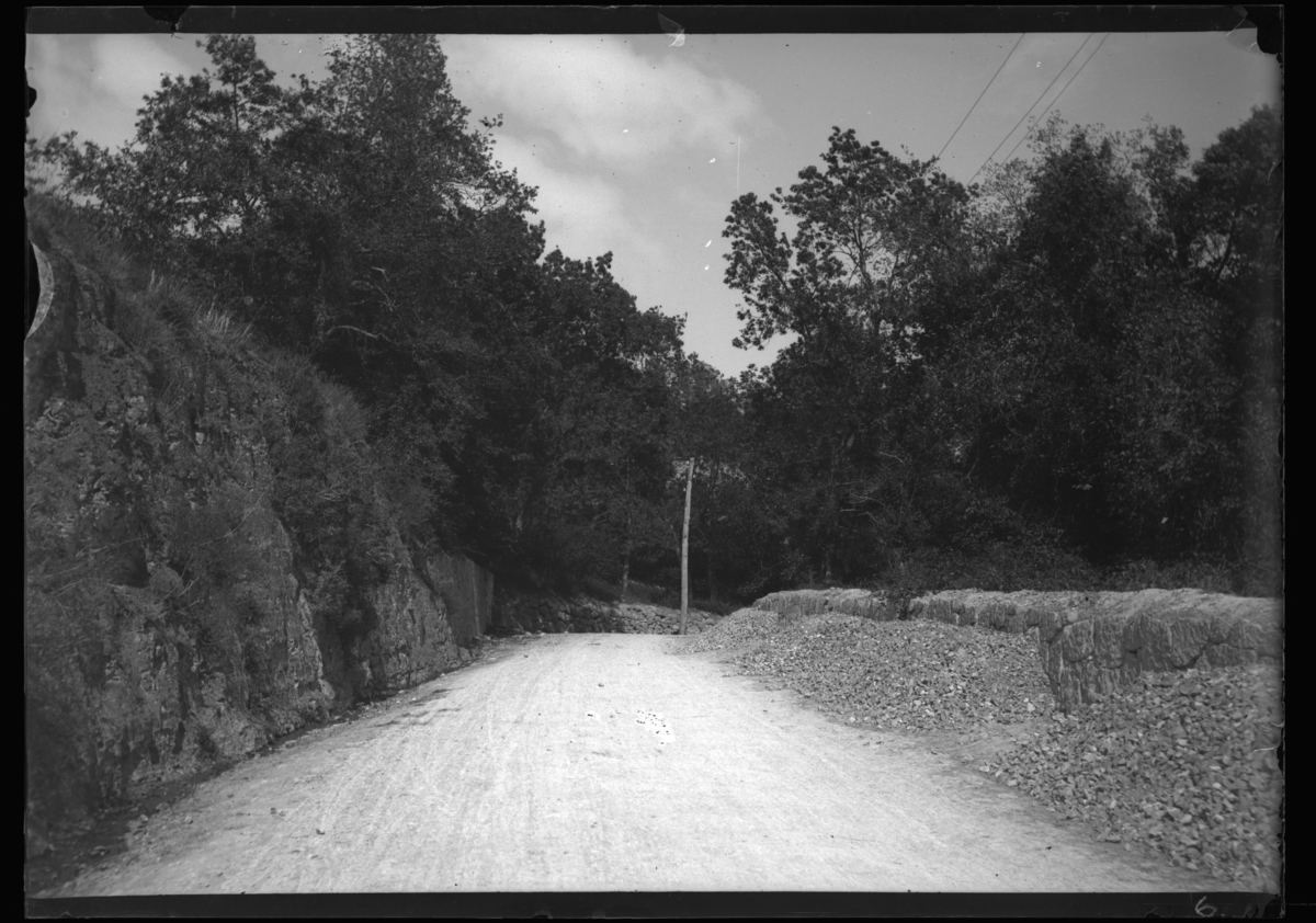 'Vy med grusväg kantad av bergvägg och på andra sidan stenmur med högar av mindre stenar intill. :: :: Ingår i serie med fotonr. 5280:1-17. Se även fotonr. 5269-5292 med bilder från Stuxbergs resa till Kaukasien.'